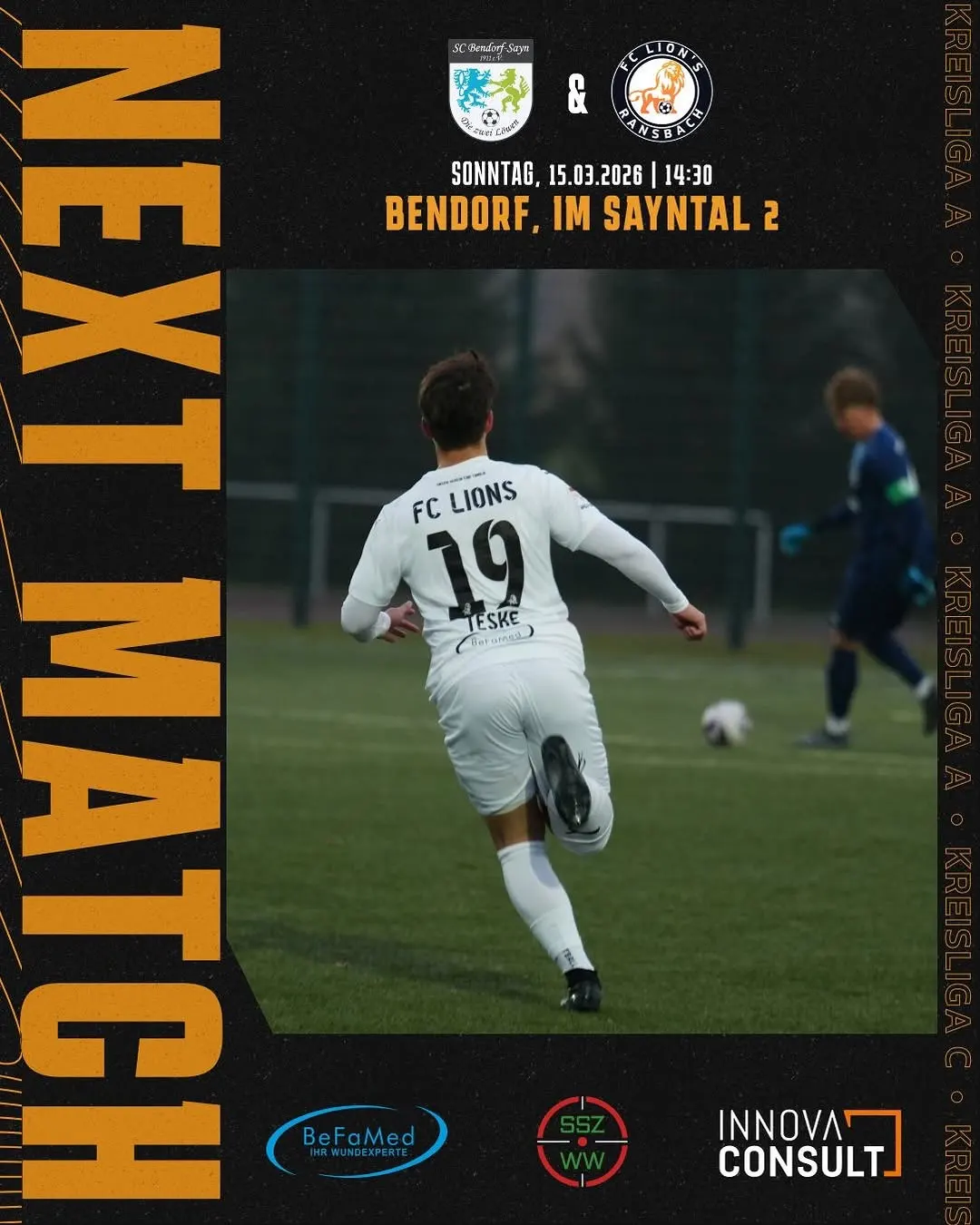Am Sonntag um 14:30 Uhr ist schließlich unsere erste Mannschaft auswärts bei der SC Bendorf-Sayn gefordert. Nach der starken Leistung gegen den Tabellenführer, bei der man lange in Unterzahl spielte und dennoch einen Punkt holte, möchte das Team nun auch im Abstiegskampf weiter punkten. Bendorf gilt als sehr unbequemer Gegner, vor allem zu Hause, was bereits das Hinspiel gezeigt hat, das trotz zweimaligem ausgleichen am Ende mit 4:2 verloren ging. Besonders offensiv verfügt der Gegner über gefährliche Spieler, die jederzeit für Tore sorgen können. Die Mannschaft ist daher gewarnt und weiß, dass es über 90 Minuten höchste Konzentration braucht, um in Bendorf etwas Zählbares mitzunehmen und an die starke Leistung gegen Ellingen anzuknüpfen. 🦁